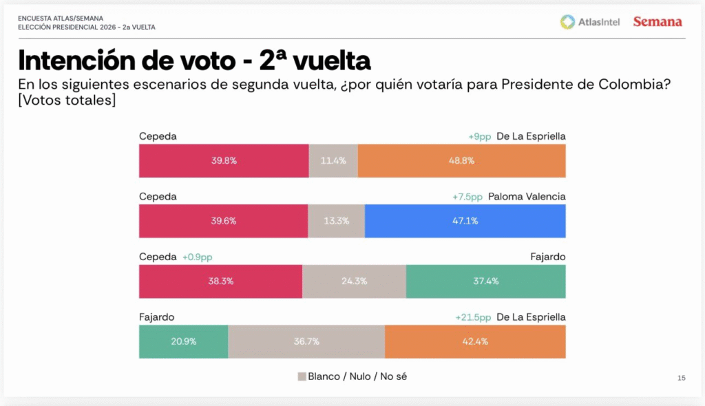 La medición se suma a un ciclo de encuestas que vienen mostrando una tendencia similar con Cepeda y de la Espriella como los dos nombres que más concentran la intención de voto, con Paloma Valencia en ascenso sostenido y consolidándose como una tercera opción competitiva.