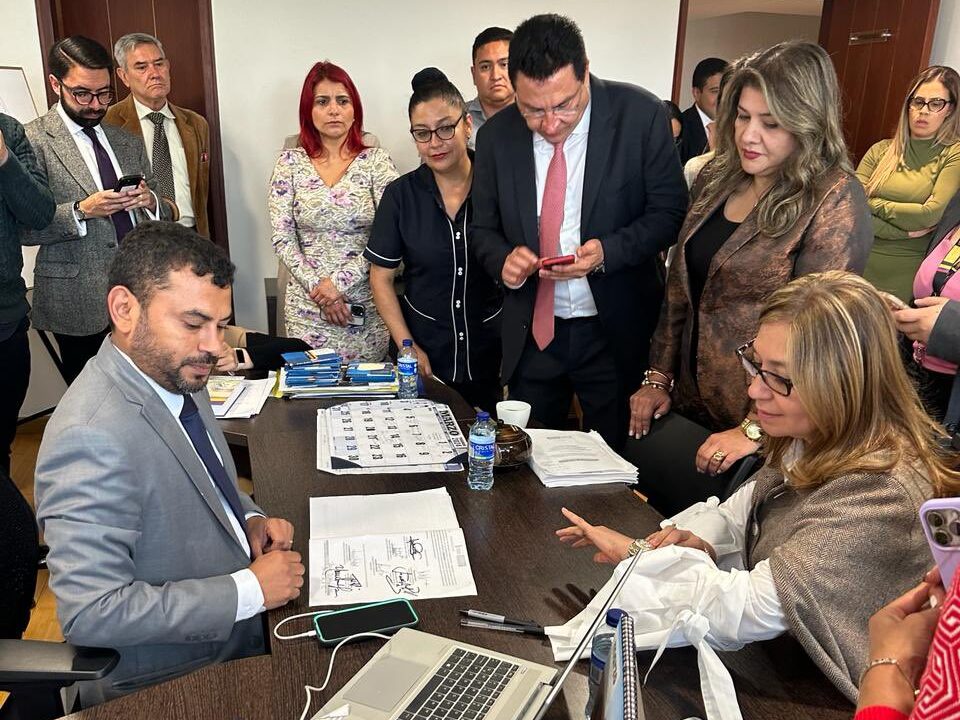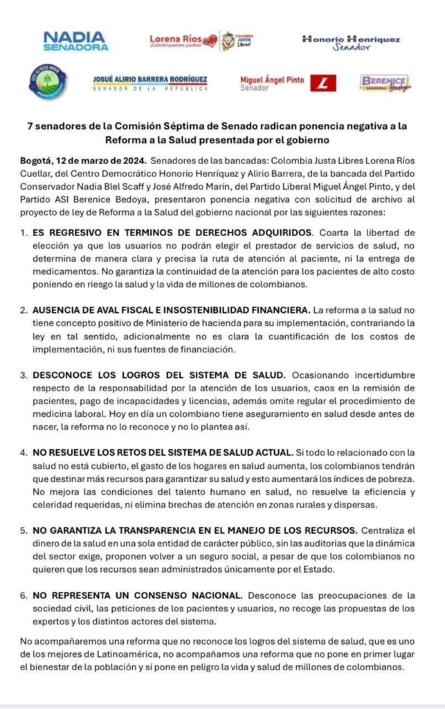 Los senadores Nadia Blel y José Alfredo Marín (Partido Conservador), Miguel Ángel Pinto (Liberal), Berenice Bedoya (ASI), Alirio Barrera y Honorio Henríquez (Centro Democrático) y Lorena Ríos (Colombia Justa y Libres), firmaron en la mañana de este martes 12 de marzo la radicación de la ponencia de archivo de la reforma a la salud en la Comisión Séptima del Senado.