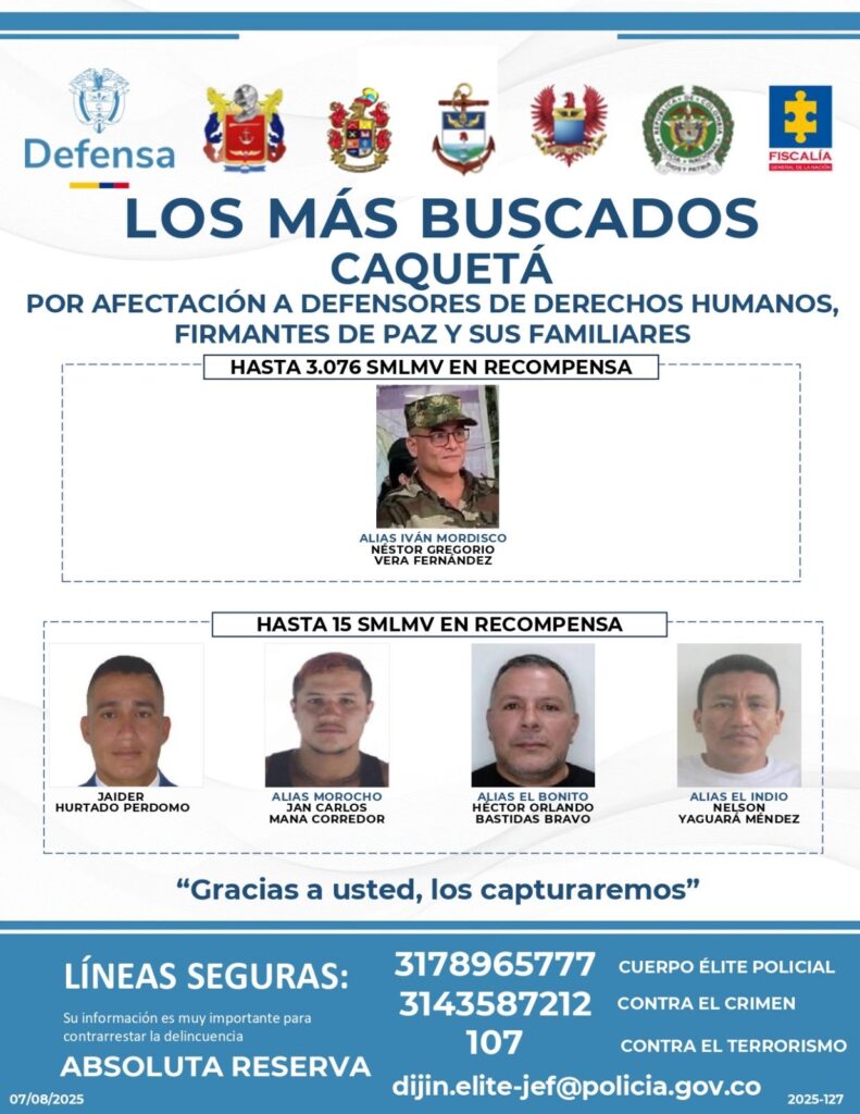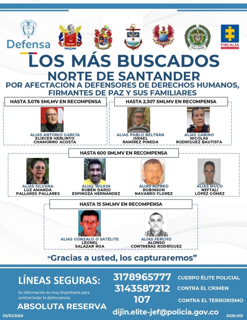 También, ofrecen hasta 2.307 SMLMV por alias Pablo Beltrán, alias Pablito, alias Nicolás Rodríguez, alias Cabino, alias Marlon y alias Raúl.