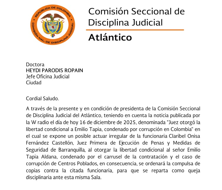 A través de un pronunciamiento oficial, la presidenta de la Comisión Seccional de Disciplina Judicial del Atlántico, Heydi Parodis Ropaín, informó que, en atención a la gravedad de los hechos y a la relevancia pública del caso, “se ordenará la compulsa de copias contra la jueza Fernández Castellón”. Estas serán remitidas para que se adelanten las actuaciones correspondientes y se repartan como queja disciplinaria ante la misma Sala.