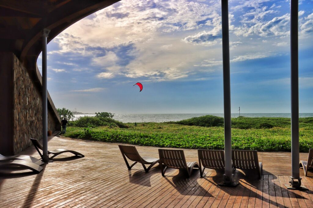 El segundo componente lo conforma la edificación principal, cuya arquitectura se inspira en la abstracción de una duna de arena, utilizando materiales como la madera y soluciones constructivas que permiten una integración armónica con el entorno natural. El tercer componente lo integran las áreas de circulación, contemplación y servicios, pensadas para ofrecer una experiencia completa tanto a deportistas como a visitantes.