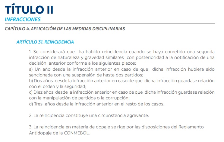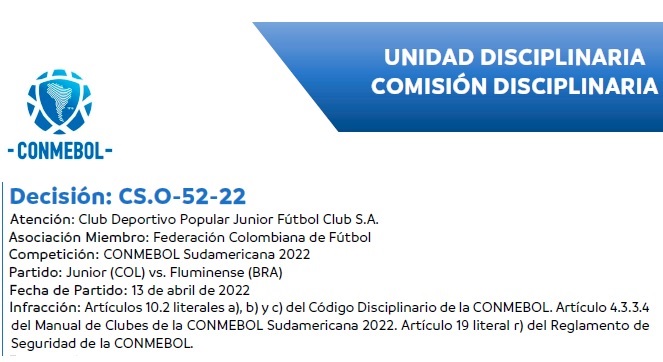 En la misma resolución, la Confederación Sudamericana le impuso una advertencia a Junior con relación a incurrir en reincidencia en cualquier infracción deportiva de igual naturaleza a la que ha traído causa el presente procedimiento, por lo que “será de aplicación lo dispuesto en el Artículo 31 del Código Disciplinario Conmebol, y las consecuencias que del mismo se pudieran derivar”.