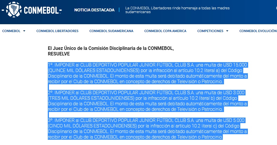 En el primer punto, Conmebol resolvió imponer al Club Deportivo Popular Junior Fútbol Club S.A. un castigo de 15 mil dólares, unos 60 millones de pesos colombianos, por vulnerar el Artículo 10.2, literal A.