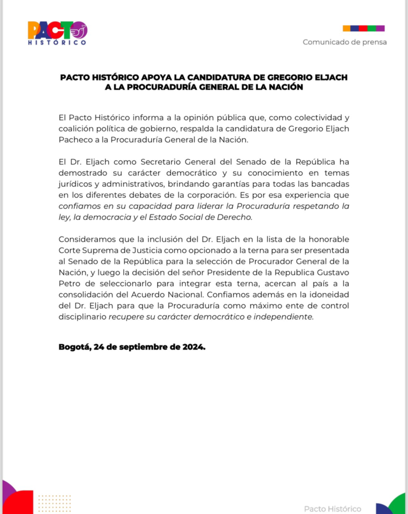 “El Pacto Histórico informa a la opinión pública que, como colectividad y coalición política de gobierno, respalda la candidatura de Gregorio Eljach Pacheco a la Procuraduria General de la Nación” afirmaron en el documento.