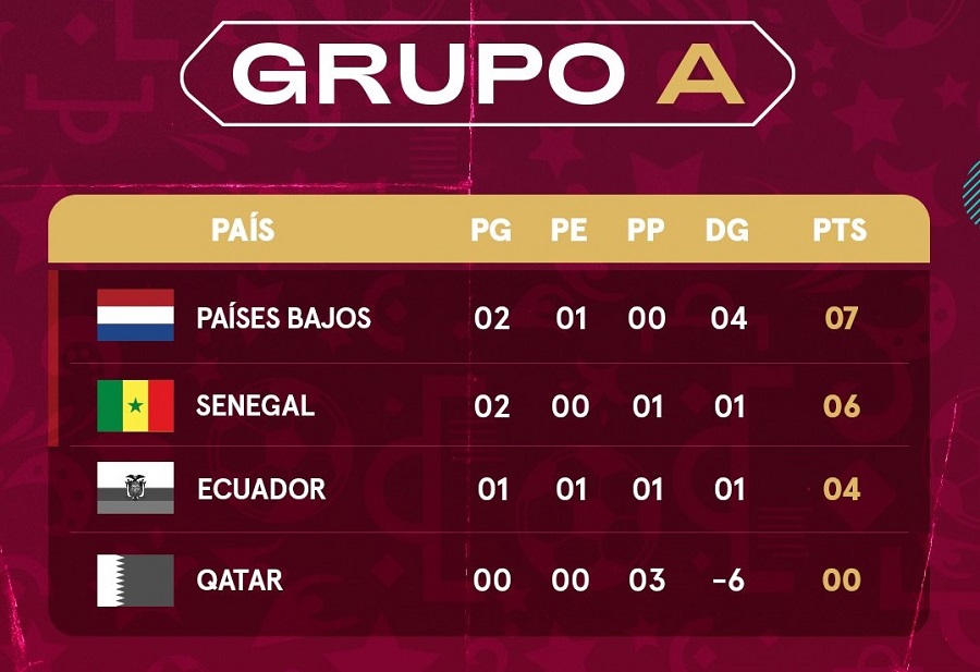 De este modo, se da la primera resolución en esta fase de grupos en la que Países Bajos, por haber culminado primero en el A, enfrentará en octavos de final al seleccionado que termine segundo en el B, que por ahora es Irán (3 puntos), juego previsto para el sábado 3 de diciembre, mientras que Senegal, por ser segundo, se medirá al primero del B, Inglaterra (4), a disputarse el domingo 4 de diciembre.