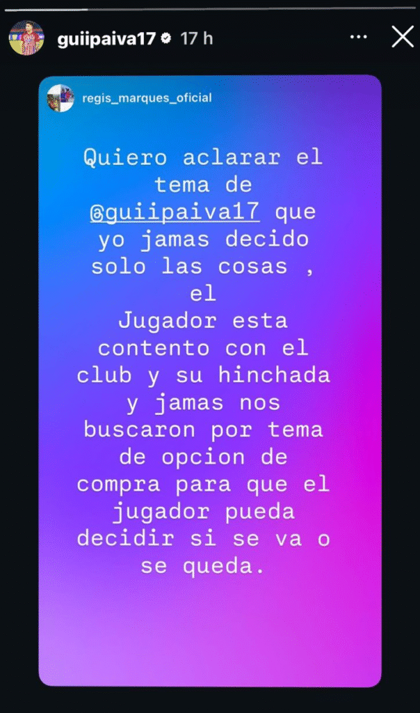 No obstante, esas declaraciones que entregó Regis, el propio delantero de 28 años salió a confrontarlas, lo que hizo en una publicación en su historia de Instagram. En esta manifestó que él está contento tanto en el club como con su hinchada.