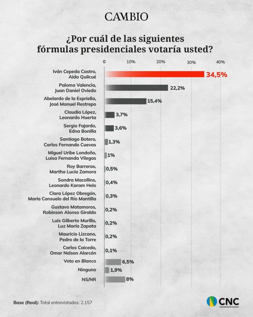 La más reciente encuesta del Centro Nacional de Consultoría (CNC), contratada por la revista Cambio y dada a conocer este domingo, revela un giro en la carrera hacia las presidenciales del 31 de mayo de 2026: Iván Cepeda (Pacto Histórico) se mantiene como amplio favorito en primera vuelta, pero Paloma Valencia (Centro Democrático) desplaza a Abelardo de la Espriella del segundo puesto y genera un escenario de segunda vuelta extremadamente cerrado.