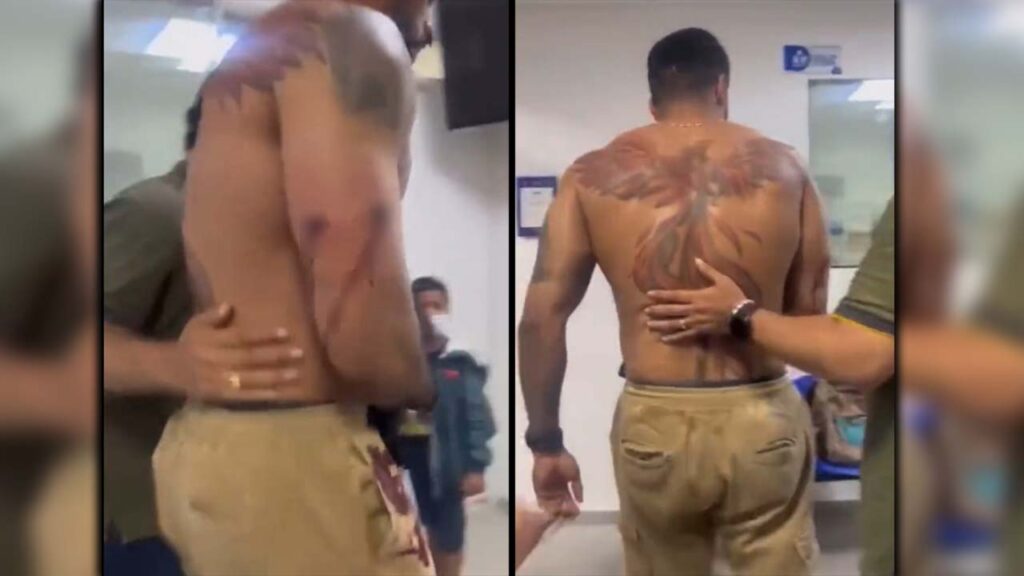 En redes sociales se ha viralizado la imagen corpulenta del precandidato ingresando a un centro médico, sin camisa, con varios tatuajes en la espalda y su herida visible en el brazo.
