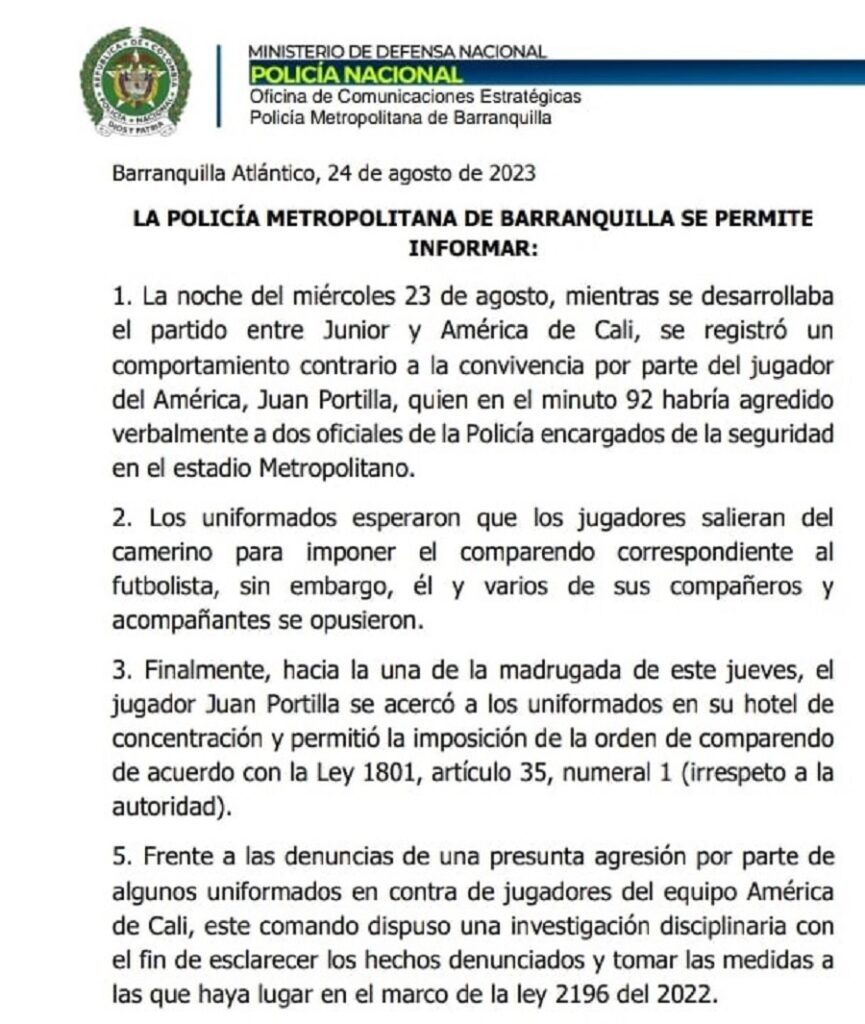Ante la fuerte gresca registrada entre jugadores del América de Cali y miembros de la Policía Metropolitana de Barranquilla, la noche de ayer miércoles en una de las zonas de traslado del estadio Metropolitano, la institución policial emitió hace pocos minutos un comunicado de prensa dando su versión de lo sucedido, aguardándose ahora por la explicación del equipo de fútbol de Cali.
