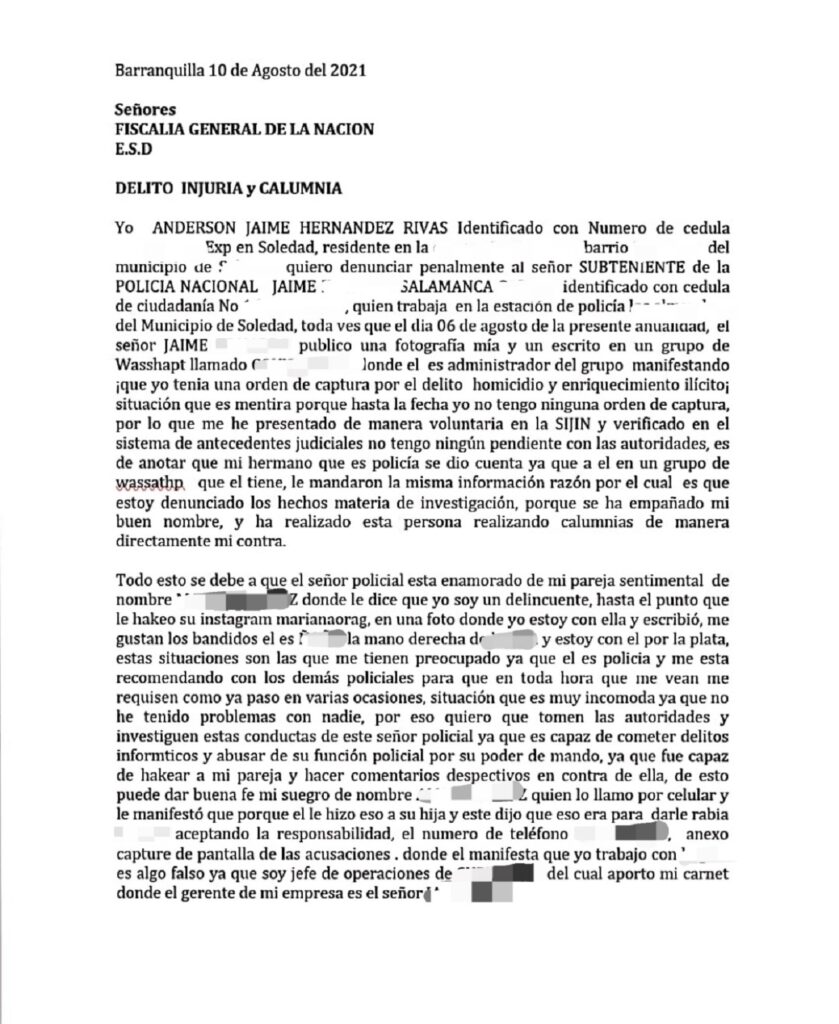 La supuesta cadena de desprestigio comenzó el 13 de junio de este año cuando Hernández estaba en un estadero con su pareja. “Ella subió una foto conmigo, él fue el primero que vio el estado y le dijo: ‘Uy, me cambiaste por el bandido ese‘, y desde ahí comenzó el cuento conmigo, así que yo un día hablé con él y me dijo que como era policía tenía información de que yo era ‘delincuente’”.