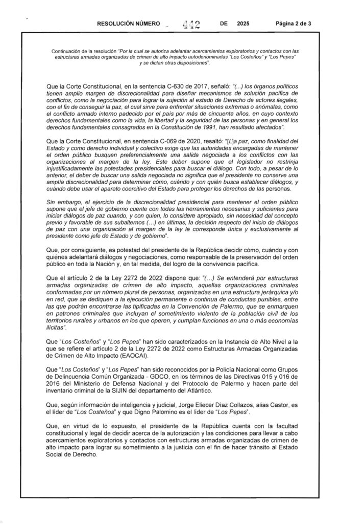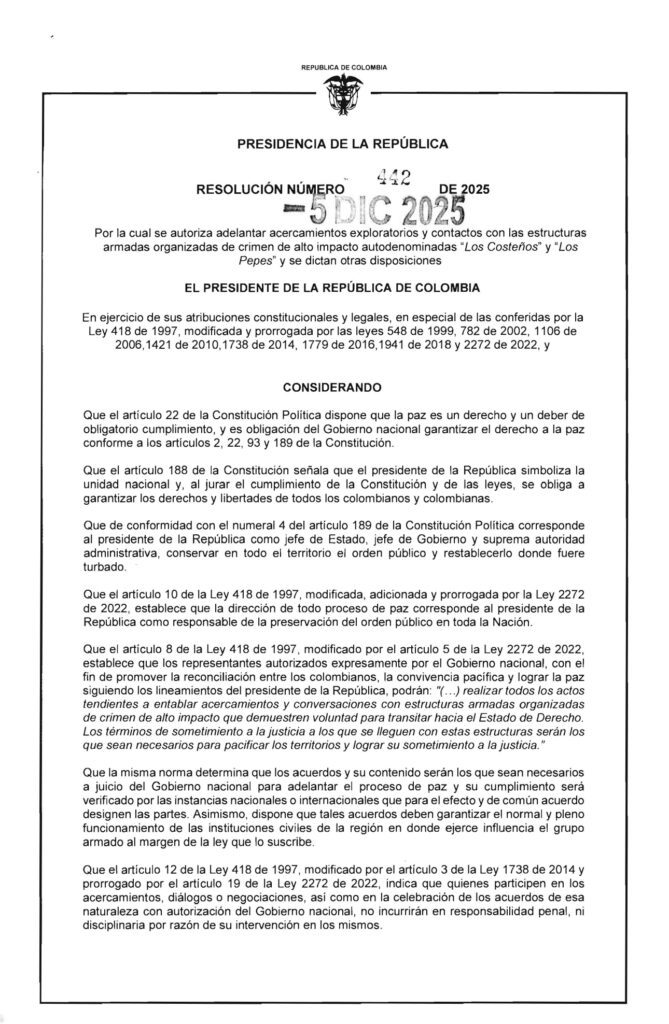 En un paso clave de su política de “paz total”, el presidente Gustavo Petro firmó la Resolución 442 de 2025, que autoriza los primeros acercamientos exploratorios y contactos formales con las bandas criminales los Pepes y los Costeños, quienes operan en Barranquilla, su área metropolitana y varios municipios del departamento del Atlántico.