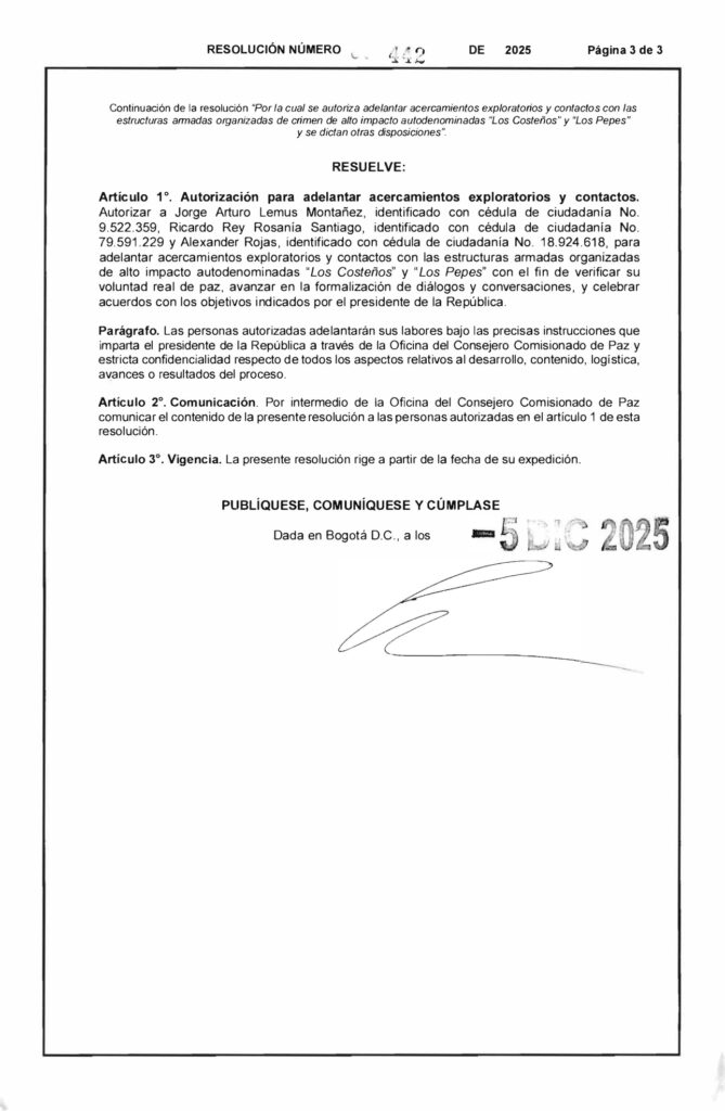 La resolución, firmada por el mandatario en ejercicio de sus atribuciones constitucionales, se enmarca en la Ley 418 de 1997 –modificada por normativas como la Ley 2272 de 2022– que faculta al Ejecutivo para liderar procesos de paz con grupos armados al margen de la ley. Según el texto oficial, se autoriza específicamente a tres altos funcionarios para adelantar estos contactos: Jorge Arturo Lemus Montaño, director de la Dirección Nacional de Inteligencia (DNI); Ricardo Rey, director de Contrainteligencia de la DNI; y Alexander Rojas.