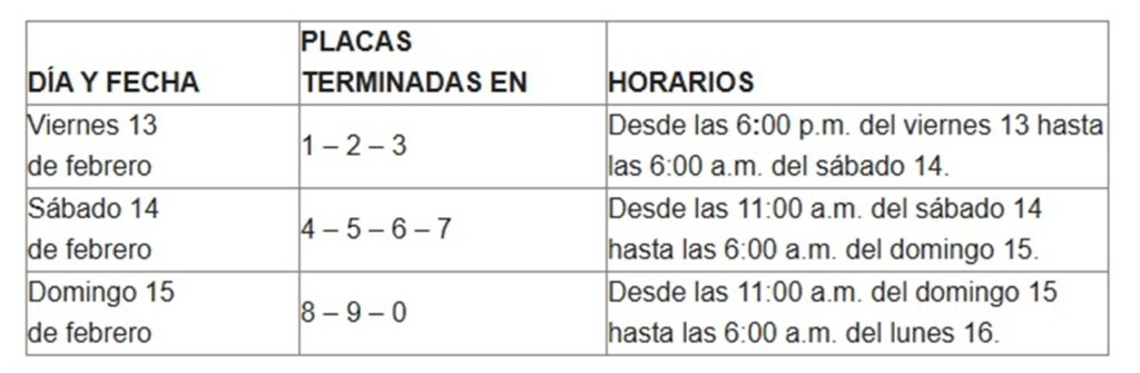 Se prohíbe la circulación de todo tipo de vehículos los días sábado 14, domingo 15 y lunes 16 de febrero en la zona conformada por las siguientes vías: