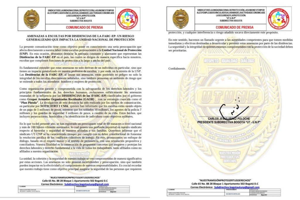 “Es fundamental entender que estas amenazas no solo derivan de un individuo en particular, sino que tienen un impacto generalizado en nuestra profesion de escoltas, y por ende, en la misión de la UNP. Las Desidencias de la FARC-EP, al lanzar sus amenazas, están poniendo en peligro no solo la integridad de los escoltas directamente señalados, sino también presentan un ambiente de riesgo que se extiende a todos los miembros hombres y mujeres de protección”, aseveraron desde la UNP.