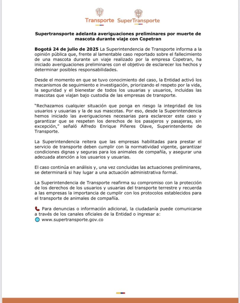 En las últimas horas, la Superintendencia de Transporte anunció a la opinión pública que, frente al lamentable caso reportado sobre el fallecimiento de una mascota durante un viaje realizado por la empresa Copetran, ha iniciado averiguaciones preliminares con el objetivo de esclarecer los hechos y determinar posibles responsabilidades.