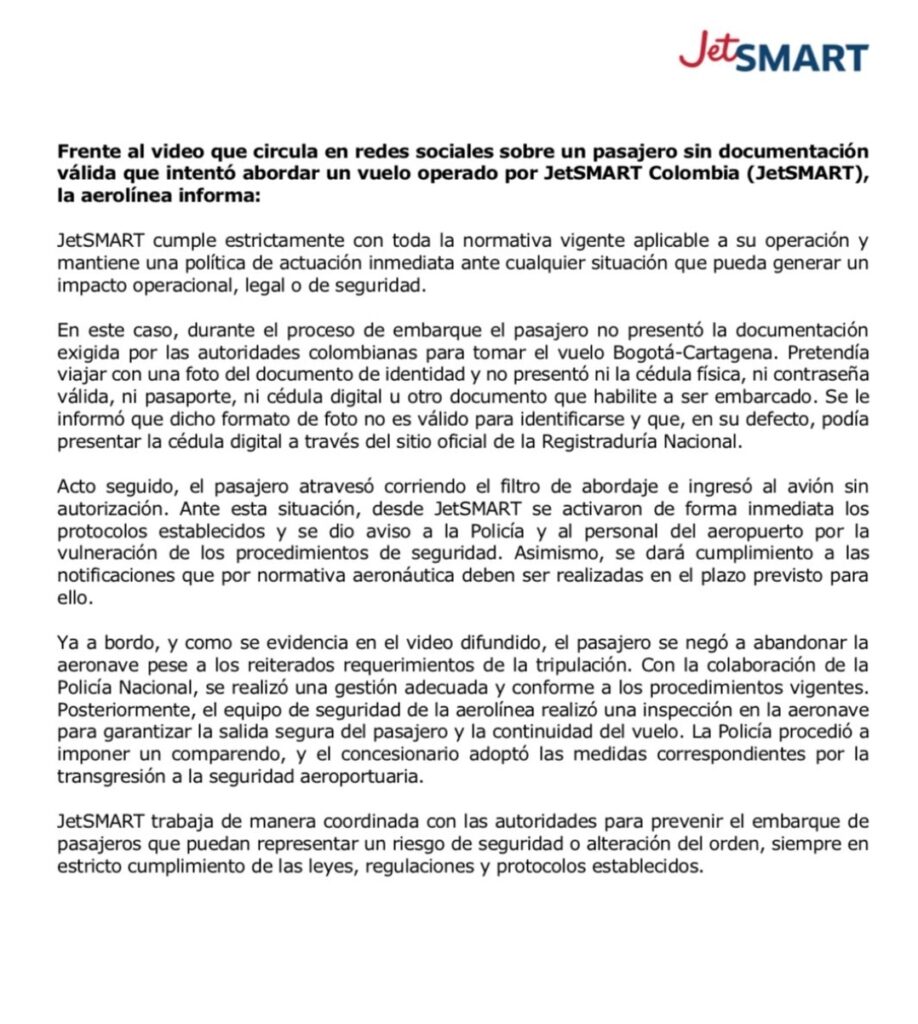 “En este caso, durante el proceso de embarque el pasajero no presentó la documentación exigida por las autoridades colombianas para tomar el vuelo Bogotá-Cartagena. Pretendía viajar con una foto del documento de identidad y no presentó ni la cédula física ni contraseña válida ni pasaporte, ni cédula digital u otro documento que lo habilitara para ser embarcado. Se le informó que dicho formato de foto no es válido para identificarse y que, en su defecto, podía presentar la cédula digital a través del sitio oficial de la Registraduría Nacional.