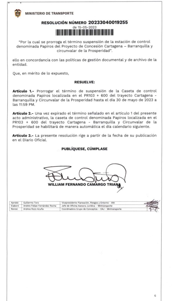 En las últimas horas, la ANI dio a conocer una nueva resolución que extiende hasta el 30 de mayo el no cobro del peaje Papiros.