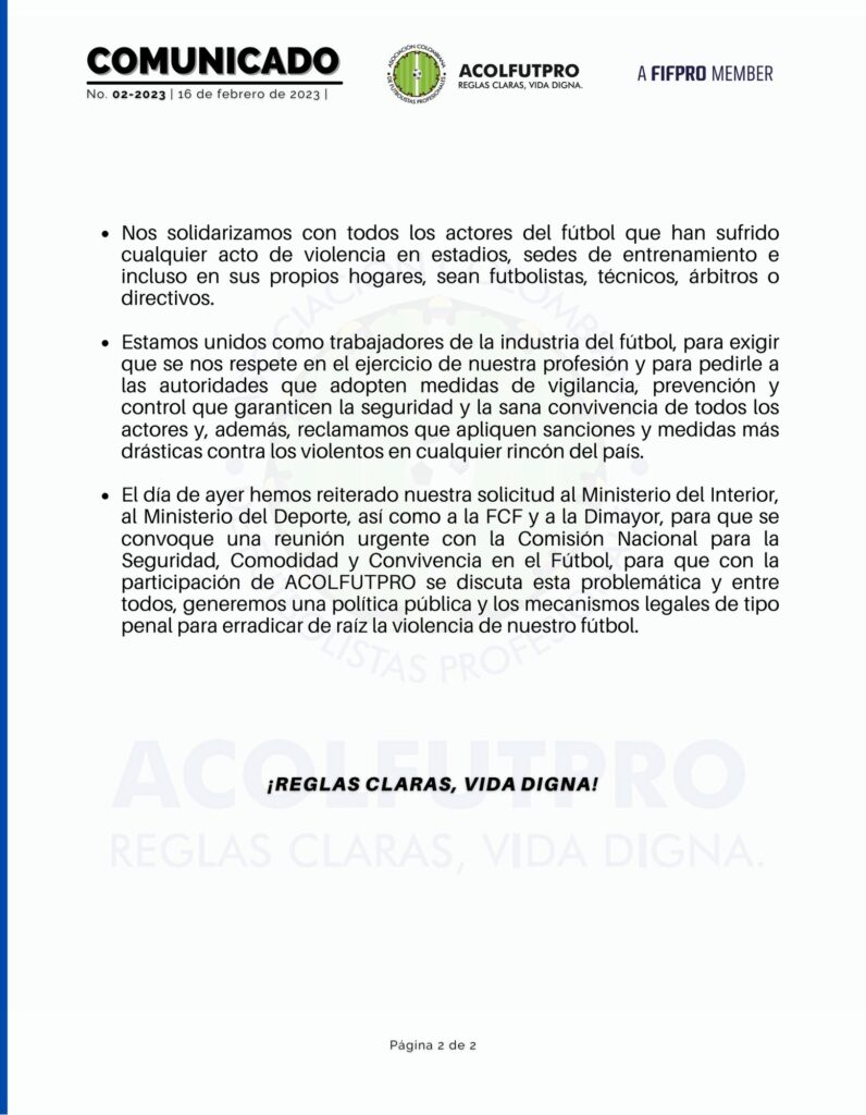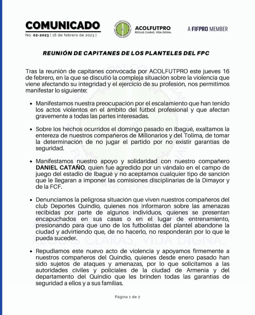 “Denunciamos la peligrosa situación que viven nuestros compañeros del club Deportes Quindío, quienes nos informaron sobre las amenazas recibidas por parte de algunos individuos, quienes se presentan encapuchados en sus casas o en el lugar de entrenamiento, presionando para que uno de los futbolistas del plantel abandone la ciudad y advirtiendo que, de no hacerlo, no responderán por lo que le pueda suceder”, se lee en el comunicado emitido por Acolfutpro.