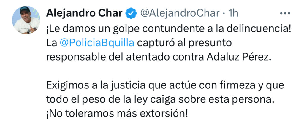 “¡Le damos un golpe contundente a la delincuencia! La Policía Metropolitana de Barranquilla capturó al presunto responsable del atentado contra Adaluz Pérez. Exigimos a la justicia que actúe con firmeza y que todo el peso de la ley caiga sobre esta persona. ¡No toleramos más extorsión!”, expresó el mandatario.