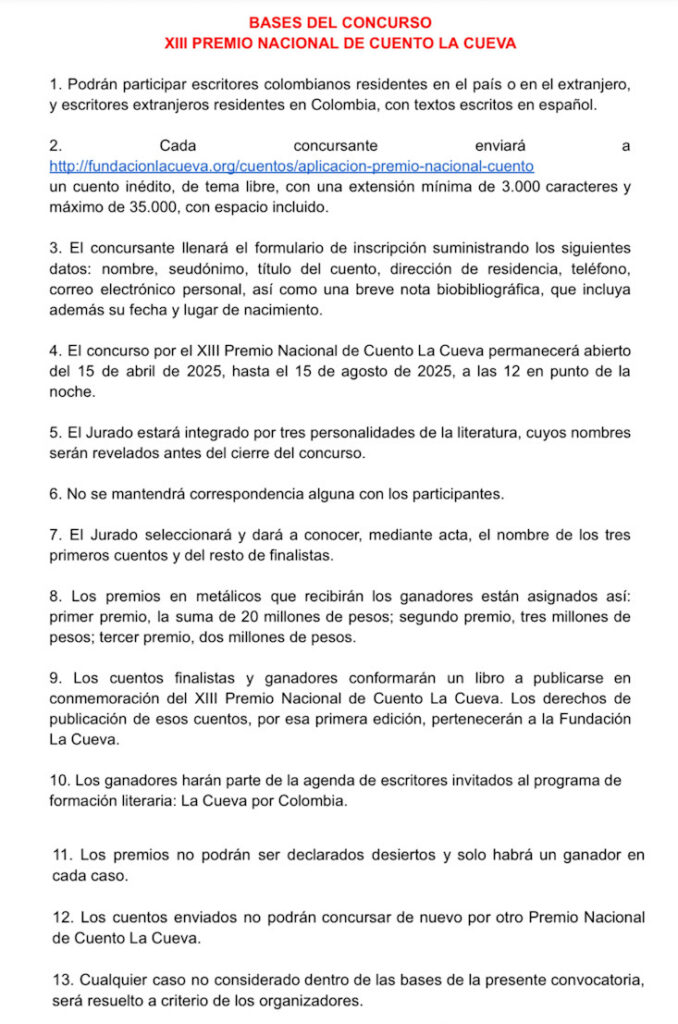 La Fundación La Cueva recuerda que el 30 de septiembre de 2025 vence el plazo para inscribirse en el XIII Premio Nacional de Cuento La Cueva, uno de los certámenes literarios más importantes del país, que continúa consolidándose como plataforma de visibilidad para narradores colombianos y residentes en Colombia.