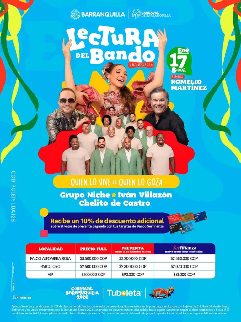 “Este viernes 16 de enero podrás reclamar tu boleta para que vivas el evento que apertura el Carnaval 2026, la entrega de boletas será para las localidades norte, oriental y occidental. Se realizará en el estadio Romelio Martínez en la taquilla ubicada sobre la calle 72“, destacó el Distrito.