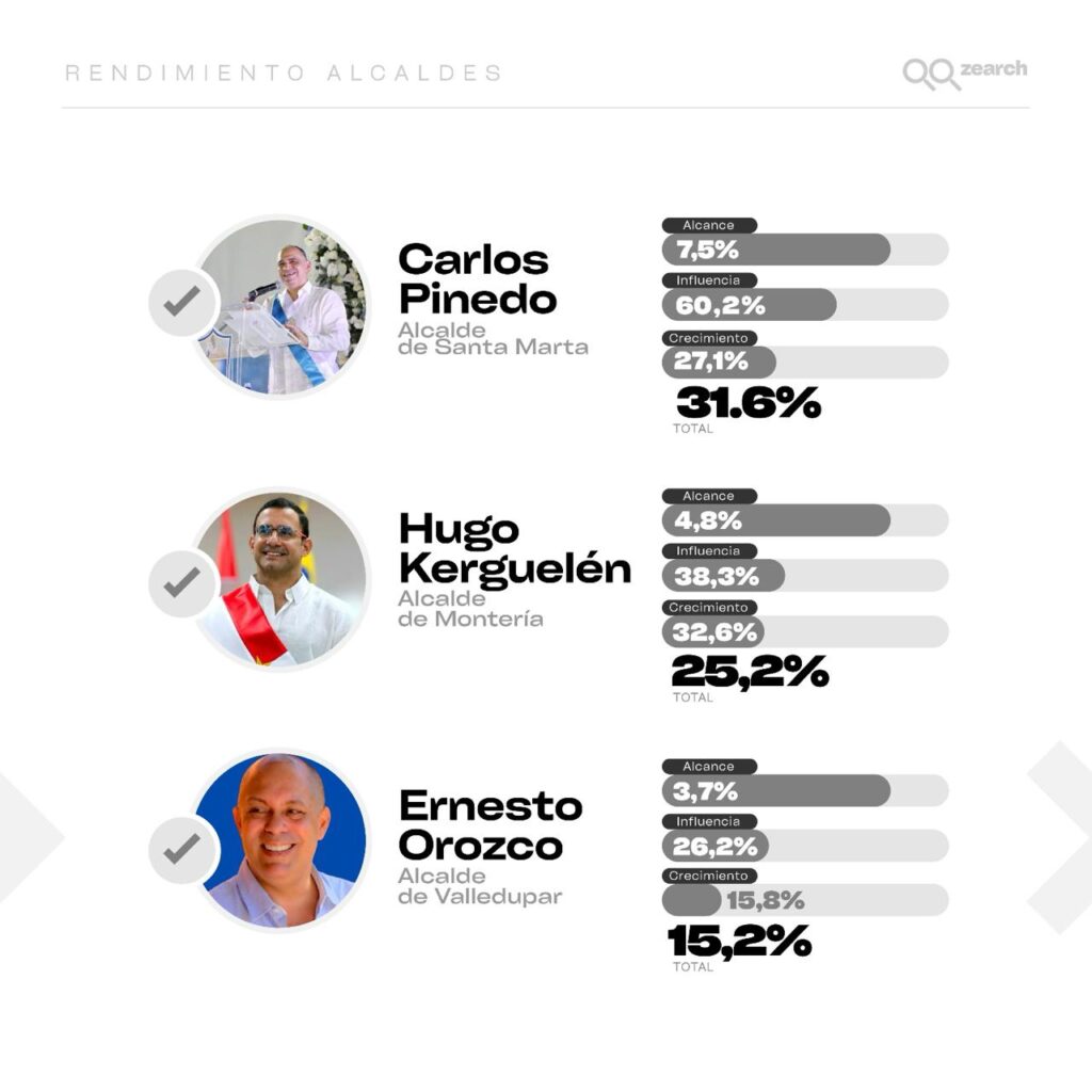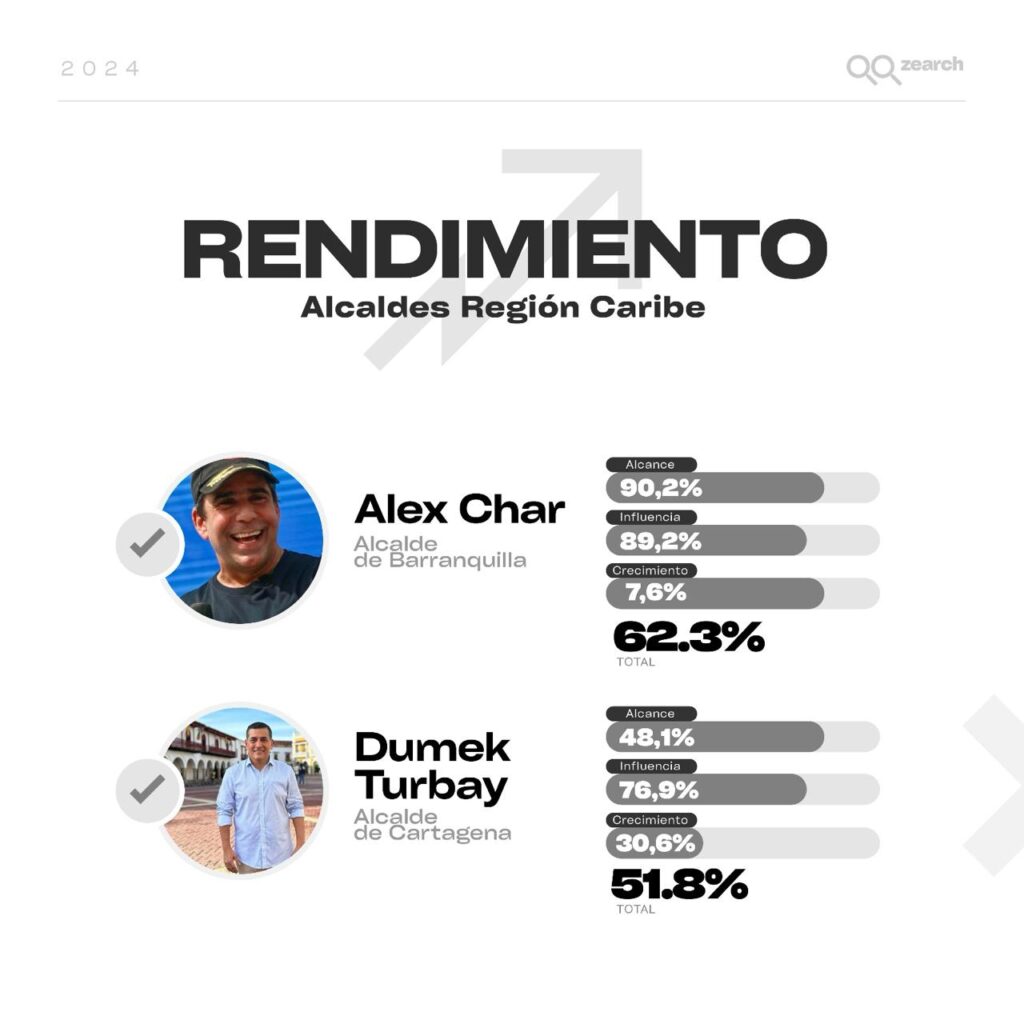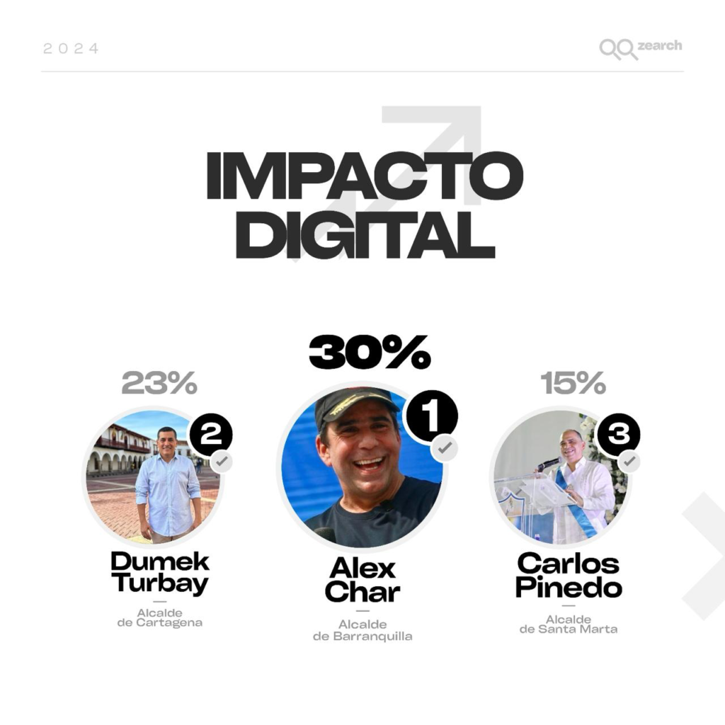 En términos generales, según la firma, el impacto digital de estos siete alcaldes ha sido durante estos primeros 100 días así: Alejandro Char (30%); Dumek Turbay (23%); Carlos Pinedo (15%); Hugo Kerguelén (12%); Ernesto Orozco (7%); Genaro Redondo (7%) y Yahir Acuña (6%).