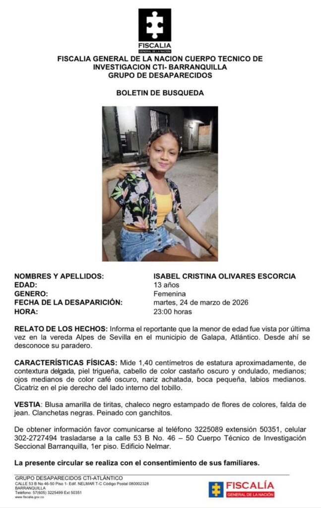 Angustiados se encuentran los padres de Isabel Cristina Olivares Escorcia, menor de 13 años de edad que fue vista por última vez el pasado 24 de marzo en su vivienda, en la vereda Alpes de Sevilla, en el municipio de Galapa, Atlántico.