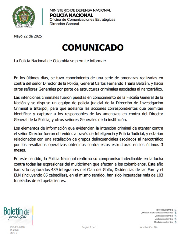 Seguidamente añadieron: “Las intenciones criminales fueron puestas en conocimiento de la Fiscalía General de la Nación y se dispuso un equipo de policía judicial de la Dirección de Investigación Criminal e Interpol, para que adelante las acciones correspondientes que permitan identificar y capturar a los responsables de las amenazas en contra del director general de la Policía y otros señores generales de la institución”.