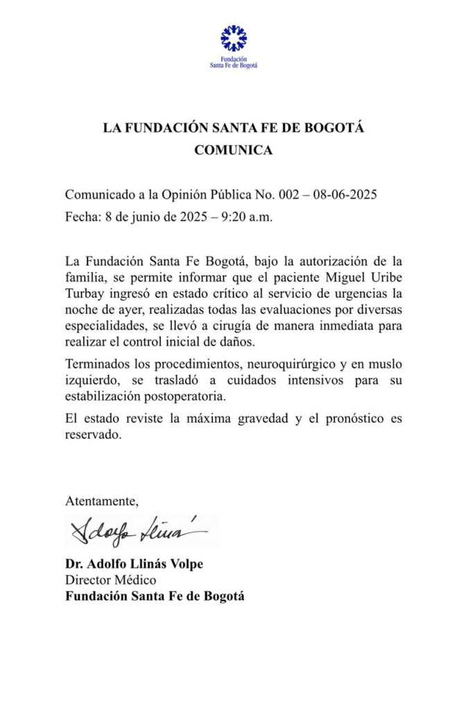 “La Fundación Santa Fe Bogotá, bajo la autorización de la familia, se permite informar que el paciente Miguel Uribe Turbay ingresó en estado crítico al servicio de urgencias la noche de ayer, realizadas todas las evaluaciones por diversas especialidades, se llevó a cirugía de manera inmediata para realizar el control inicial de daños”, explicaron.
