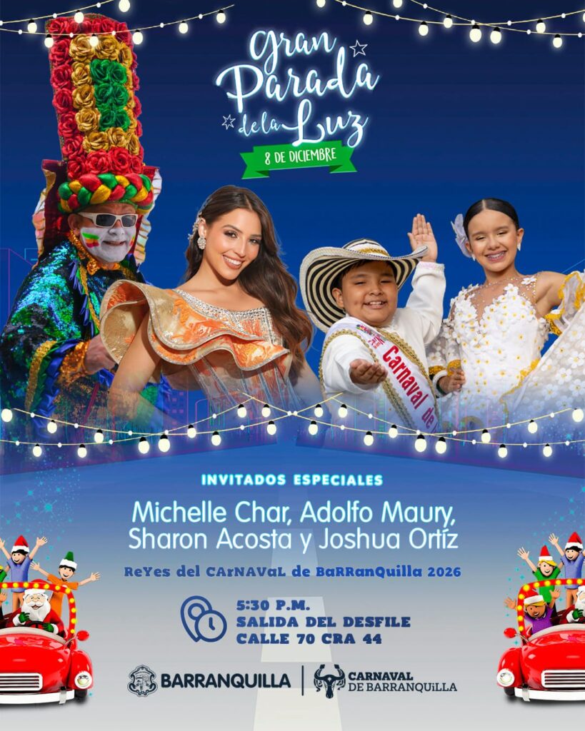 Los reyes del Carnaval de Barranquilla 2026 serán invitados especiales a la Gran Parada de la Luz, iluminando el tradicional recorrido navideño que recorrerá la carrera 44 este 8 de diciembre y reunirá a más de 2.000 artistas en este evento organizado por la Fundación Pan y Panela.