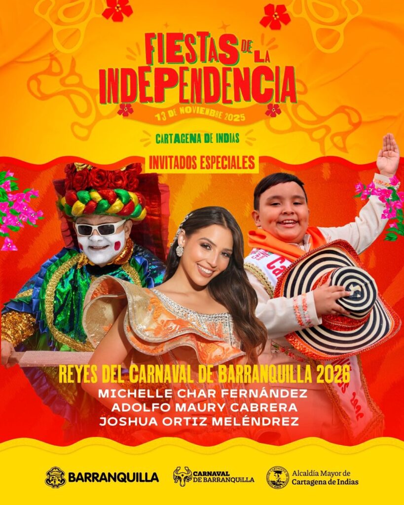 La reina del Carnaval 2026, Michelle Char Fernández, el rey Momo, Adolfo Maury, junto a su danza de 150 años de historia, el Congo Grande de Barranquilla, y el rey del Carnaval de los Niños, Joshua Ortiz y el tradicional Garabato de la 8, brillarán en la ciudad “Fantástica” de Colombia en este recorrido cultural que se realizará el 13 de noviembre de 2025 en el marco de las Fiestas de la Independencia de Cartagena, una celebración que enaltece la identidad del Caribe colombiano.