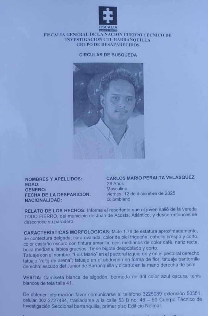Carlos Mario Peralta Velásquez salió de su casa en la vereda Todo Fierro del municipio de Juan de Acosta, Atlántico, rumbo a Barranquilla para ver el partido de Junior contra Tolima, el pasado viernes 12 de diciembre, desde ese momento se desconoce de su paradero y la angustia consume a sus seres queridos.