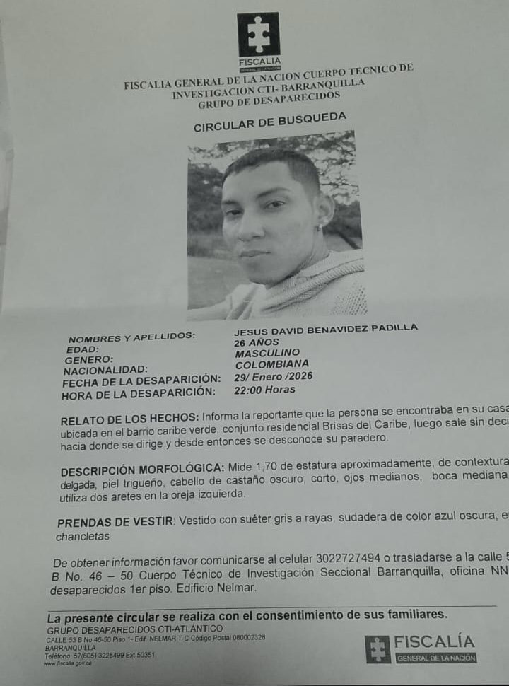 Sin decir hacia donde se dirigía partió de su casa en el conjunto residencial Brisas del Caribe, en Caribe Verde, Barranquilla, Jesús David Benavidez Padilla y, desde ese entonces, 29 de enero de 2026, se desconoce su paradero.