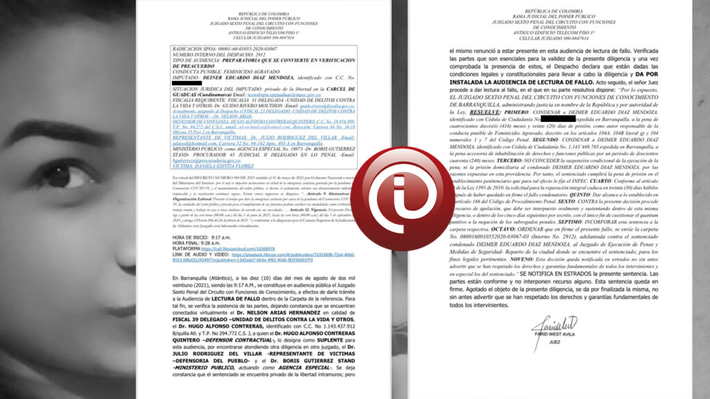El Juzgado Sexto Penal del Circuito con Funciones de Conocimiento profirió sentencia condenatoria de primera instancia en contra de Deimer Eduardo Díaz Mendoza, por el delito de Feminicidio Agravado que dejó como víctima a su expareja sentimental y madre de sus dos hijos, Daniela Espitia.