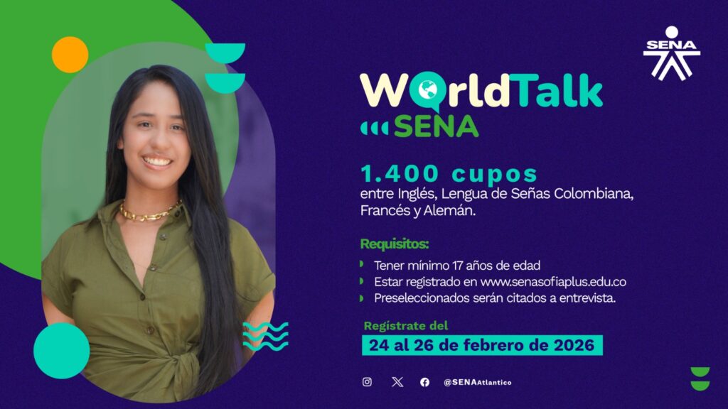 El SENA Regional Atlántico anuncia la primera oferta ‘WorldTalk SENA’ del 2026, para que jóvenes del departamento fortalezcan sus habilidades comunicativas con una formación gratuita y de calidad en inglés, lengua de señas, francés y alemán, abriendo nuevas oportunidades en el mundo laboral y académico.