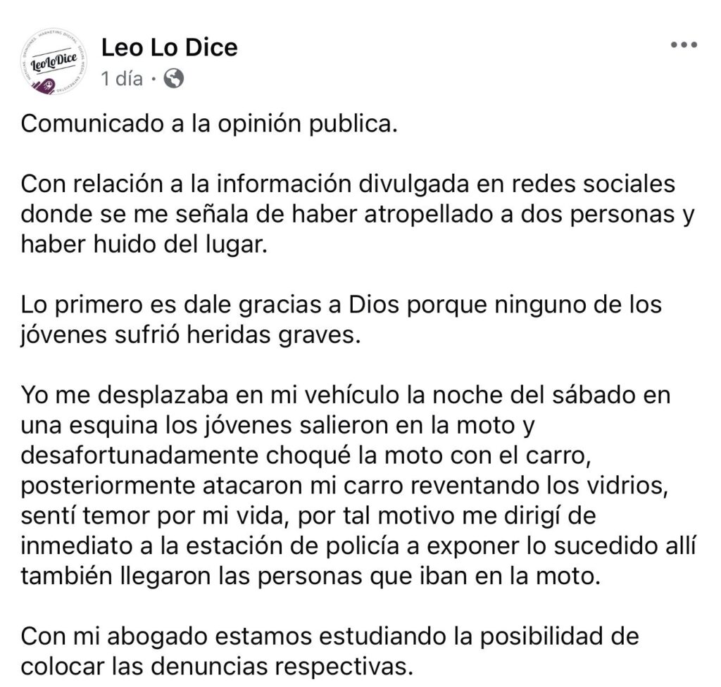 En la página de Facebook de Leo Lo Dice fue publicado el siguiente comunicado: