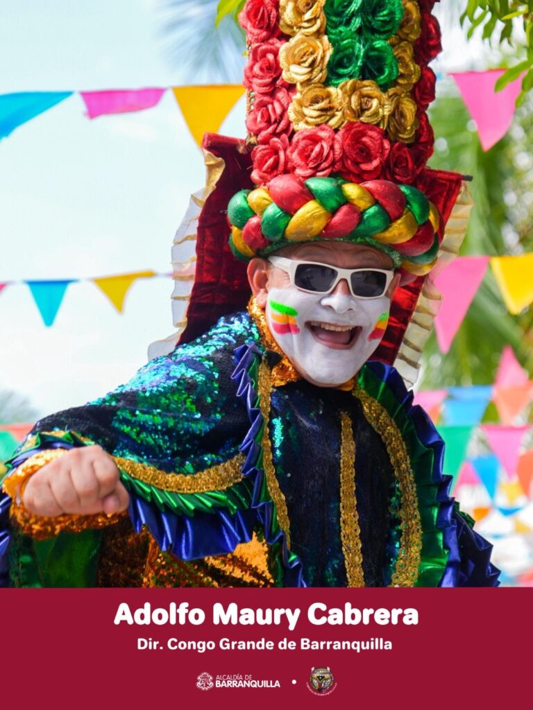 Adolfo Maury Cabrera: director de uno de los grupos folclóricos más representativos del Carnaval, el Congo Grande de Barranquilla, danza que cumple 150 años de tradición y una de las más antiguas del Carnaval. Hace parte de la cuarta generación de esta danza que hoy integran también sus hijos y nietos. Desde que dirige el Congo Grande de Barranquilla ha sido ganador de 17 Congos de Oro y recibió el Premio Aporte a la Tradición de la Secretaría de Cultura.