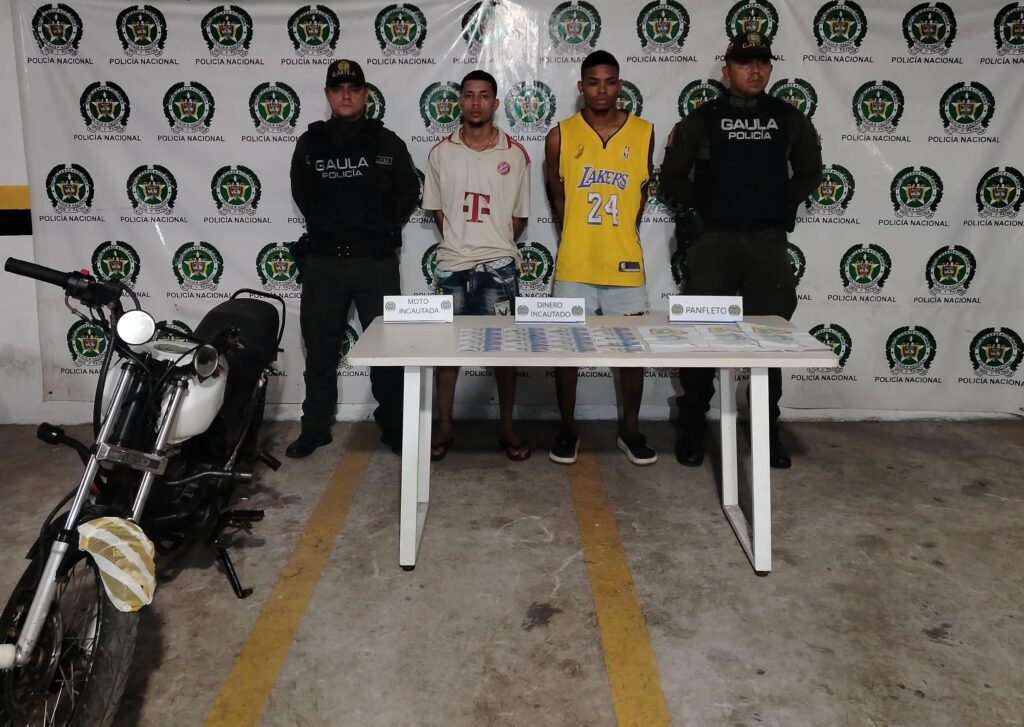Finalmente, se logró la captura de dos presuntos delincuentes en flagrancia por el delito extorsión en el municipio de Soledad a la altura del barrio Villa Valentina. En el operativo fueron encontrados tres panfletos extorsivos, un millón de pesos en efectivo y una motocicleta. Los detenidos realizaban las extorsiones a nombre del grupo delincuencial común organizado los Costeños, además, realizaban disparos a las fachadas de los establecimientos con el fin de presionar a los comerciantes para el pago de las extorsiones. Inmediatamente fueron puesto a disposición de las autoridades competentes por el delito antes mencionado.