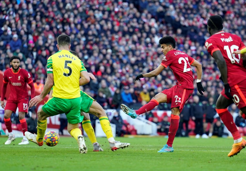El colombiano Luis Díaz entró faltando 6 minutos para que acabara el cotejo, reflejando la encomienda de su técnico Jürgen Klopp que era la de manejar la pelota para enfriar la ofensiva del Norwich, que por momentos amenazó a Liverpool con el empate.