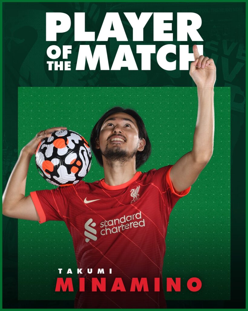 El delantero japonés Takumi Minamino fue la gran figura del partido con sus dos anotaciones para el cuadro liverpuliano. Primero, al minuto 27, Kostas Tsimikas levantó un centro desde sector izquierdo, Divock Origi controló sin oposición dentro del área rival y con un toque sutil asistió a Takumi que rompió el celofán.