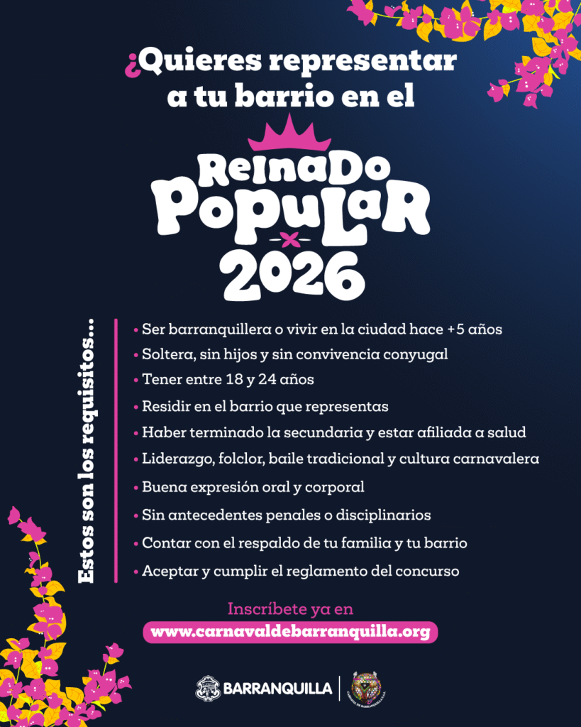 Las jóvenes que aspiren a ser parte del Reinado Popular 2026 deben tener entre 18 y 24 años, residir en el barrio que representan, ser líderes comprometidas con su comunidad y mostrar vocación social para aportar al rescate y preservación de las tradiciones del Carnaval.