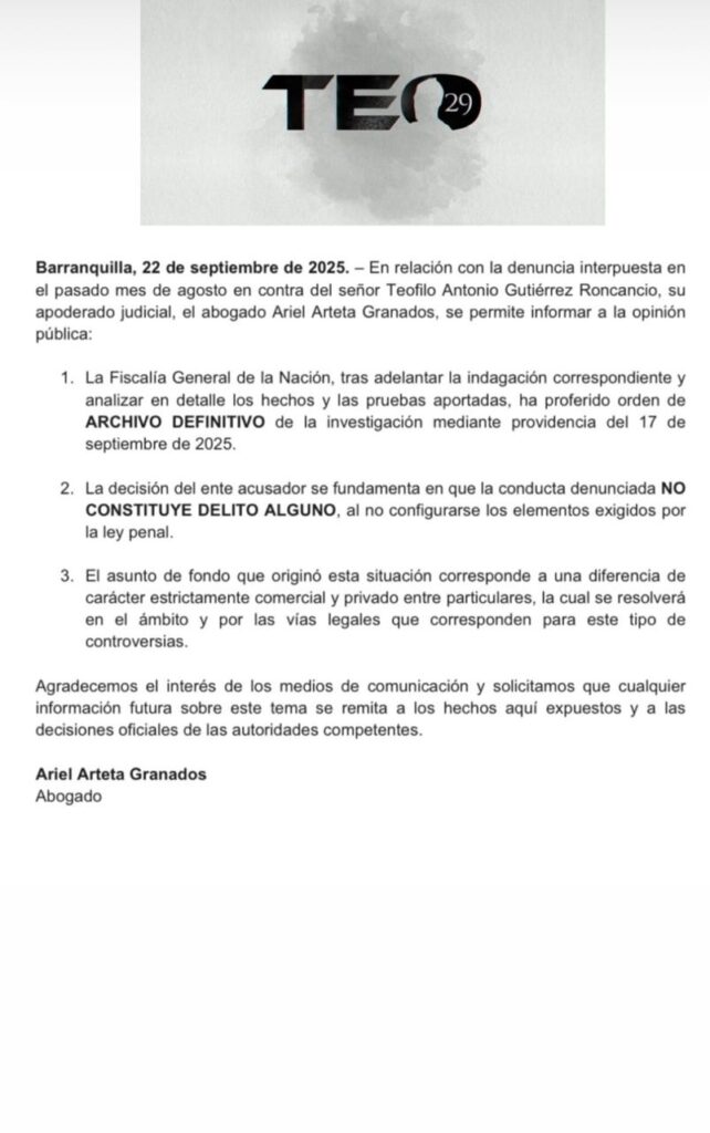 Teo informó en el documento que dio a conocer en sus redes: “La decisión del ente investigador se fundamenta en que la conducta denunciada no constituye delito alguno, al no configurarse los elementos exigidos por la ley penal”.