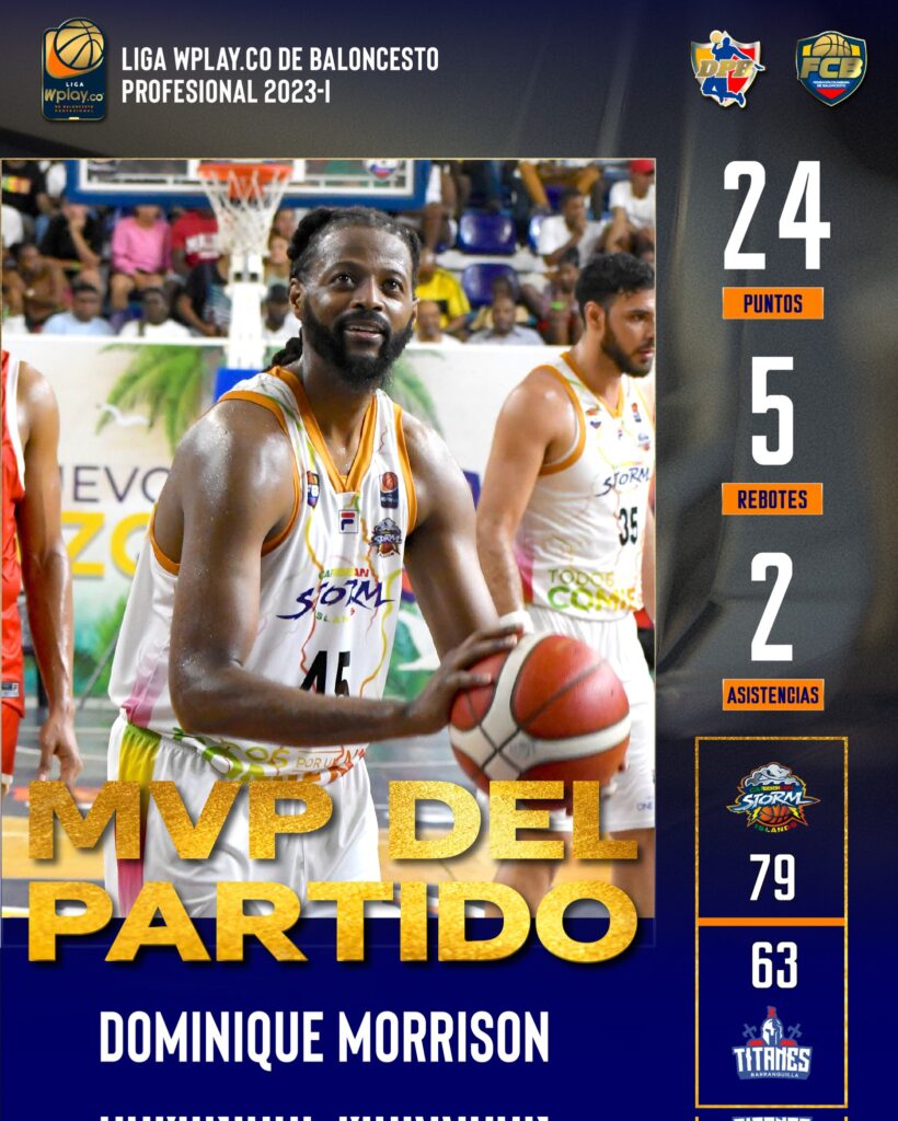 Con un Dominique Morrison imbatible encestando 24 puntos, Caribbean Storm de San Andrés Isla se fue arriba en la serie semifinal de la Liga Wplay-I ante Titanes de Barranquilla, quedando a un solo juego de instalarse en la gran final y de derrocar el legado construido por el quinteto ‘currambero’ de siete torneos ganados de forma consecutiva.