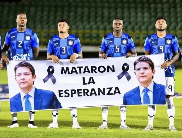 Antes de iniciarse los actos protocolarios, a los futbolistas del elenco local se les vio con dos carteles que contenían el rostro de quien venía fungiendo como precandidato presidencial y senador del Centro Democrático y acompañado con la frase: “Mataron la esperanza”.