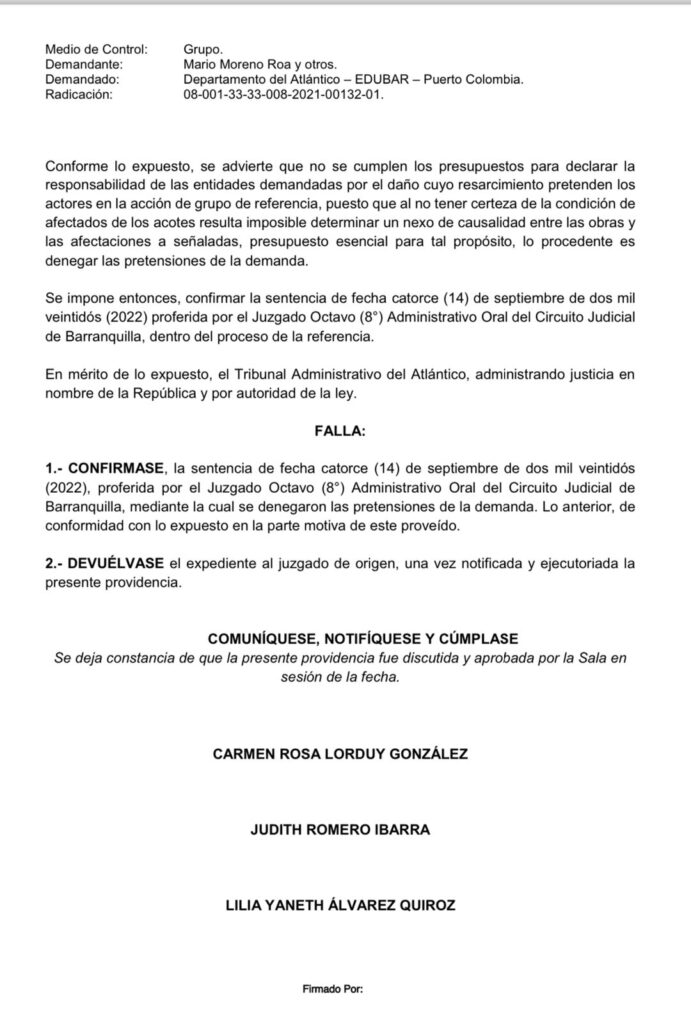 Sentencia del Tribunal Administrativo del Atlántico sobre las demandas.