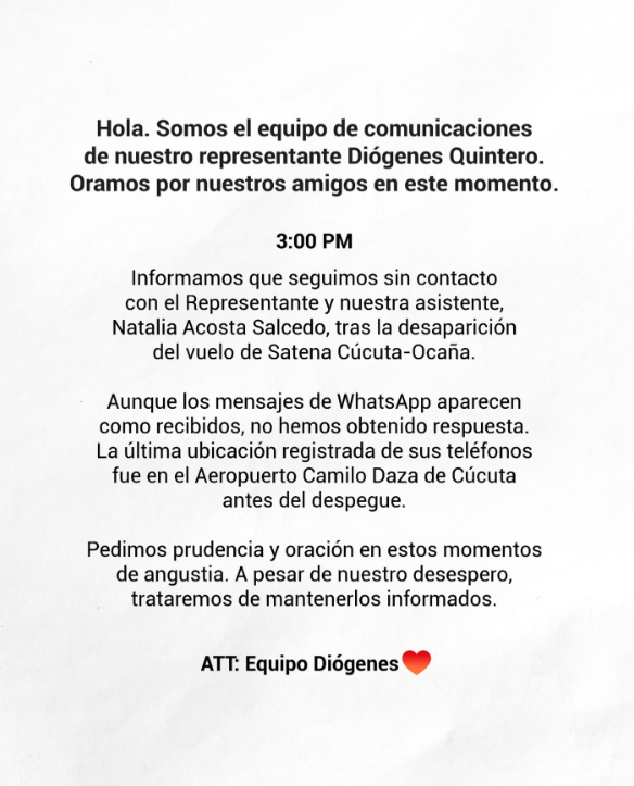 “La Dirección de Investigación de Accidentes de la Aerocivil informa informa que se encuentra recogiendo información respecto a la pérdida de comunicación de la aeronave HK4709 que cubre la ruta Cúcuta – Ocaña con 13 pasajeros y 2 tripulantes. Se activaron los protocolos correspondientes y ya iniciamos PMU. Apoyamos a las autoridades aeronáuticas en las tareas del protocolo para estas situaciones”, indicó la ministra de Transporte, Mafe Rojas.
