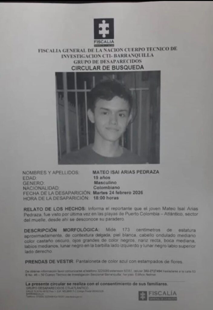 Desde el pasado 24 de febrero la angustia no cesa en el hogar de Mateo Isai Arias Pedraza, joven de 19 años de edad que desapareció mientras nadaba en playas de Puerto Colombia, Atlántico.