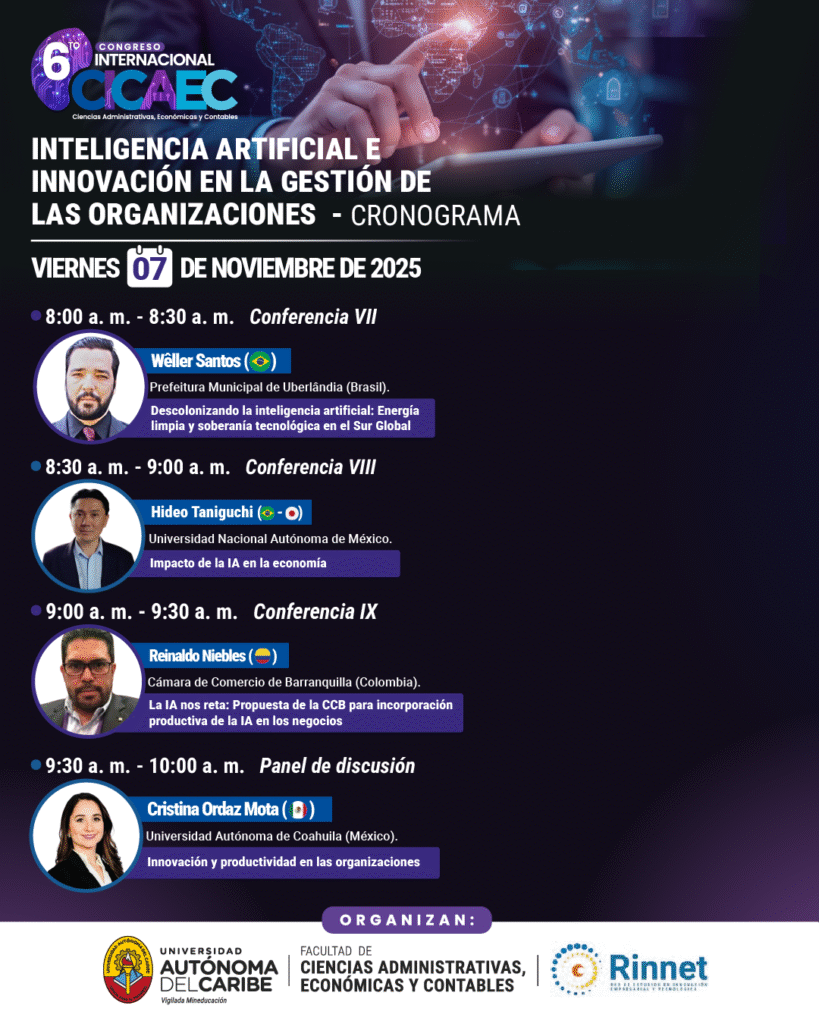 La Universidad Autónoma del Caribe, a través de su Facultad de Ciencias Administrativas, Económicas y Contables, celebra el 6.º Congreso Internacional CICAEC (Ciencias Administrativas, Económicas y Contables), un espacio académico que este año gira en torno al tema “Inteligencia Artificial e Innovación en la Gestión de las Organizaciones”.