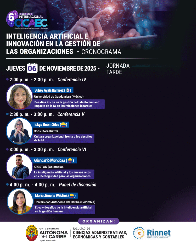 El evento reúne a destacados conferencistas provenientes de México, Chile, Brasil y Colombia, quienes comparten sus conocimientos y experiencias sobre el impacto de la inteligencia artificial (IA) en distintos ámbitos de la gestión empresarial. Las ponencias abordan temáticas clave como la toma de decisiones estratégicas, la eficiencia económica, la gestión del talento humano y la productividad organizacional en un contexto cada vez más digitalizado.