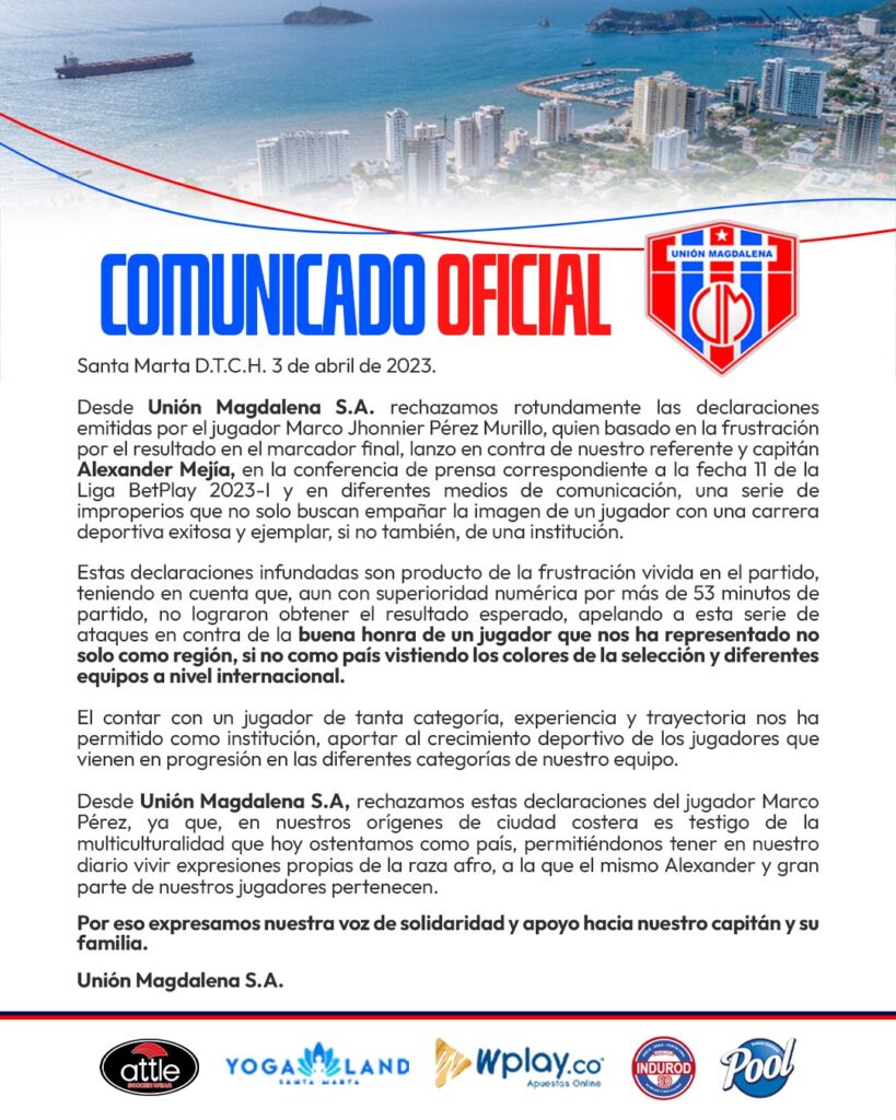 A través de un comunicado, la tarde del lunes 3 de abril Unión Magdalena rechazó las acusaciones del jugador de Águilas Doradas de Rionegro, Marco Pérez, y salió en defensa de su futbolista Alexander Mejía, con relación al polvorín que se ha levantado por supuesto racismo dado en medio del partido de la noche del domingo 2 de abril entre Unión Magdalena y el cuadro antioqueño, concerniente a la jornada 11 de la Liga Betplay-I y efectuado en el Sierra Nevada de Santa Marta.